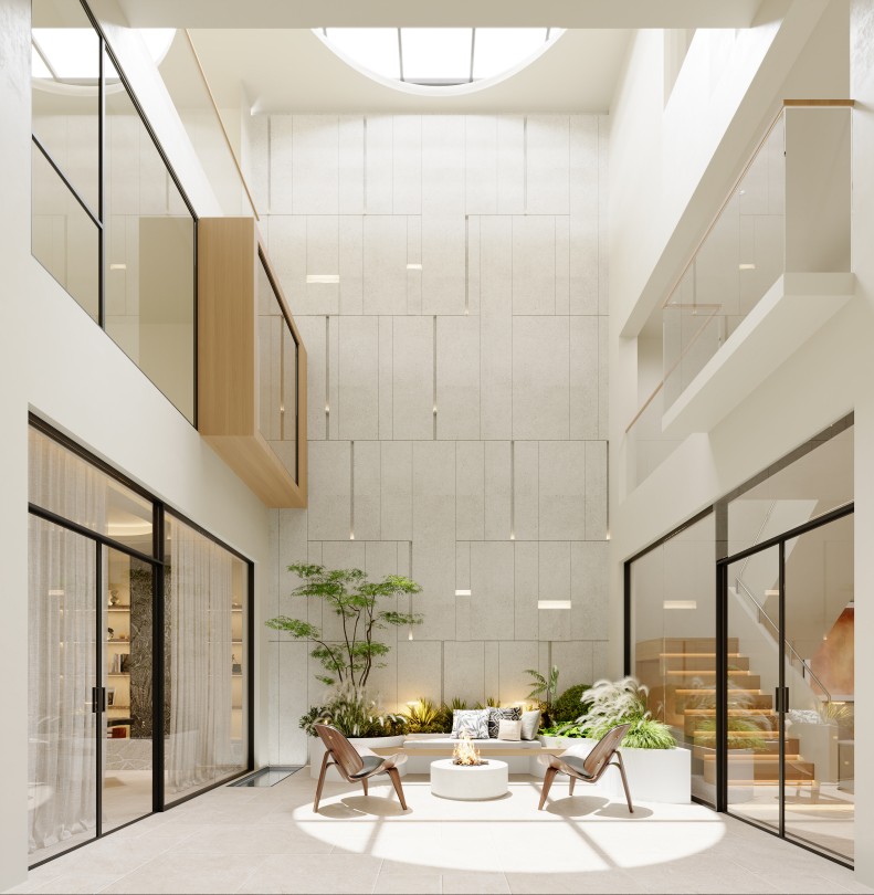 光影序曲,顶部天光与地面暖光地台交映,勾勒归家仪式感。